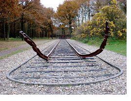 Twee monumenten, die de vernietigigende kracht van moderne transportmiddelen in de Tweede Wereldoorlog symboliseren. De spoorlijn bij Kamp Westerbork (boven) en het beeld 'De Verwoeste Stad'van Zadkine in Rotterdam. Foto's respectievelijk Kamp Westerbork (boven) en Virtueel Mobiliteitsmuseum / Max Popma (onder).